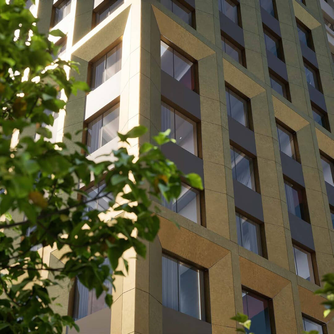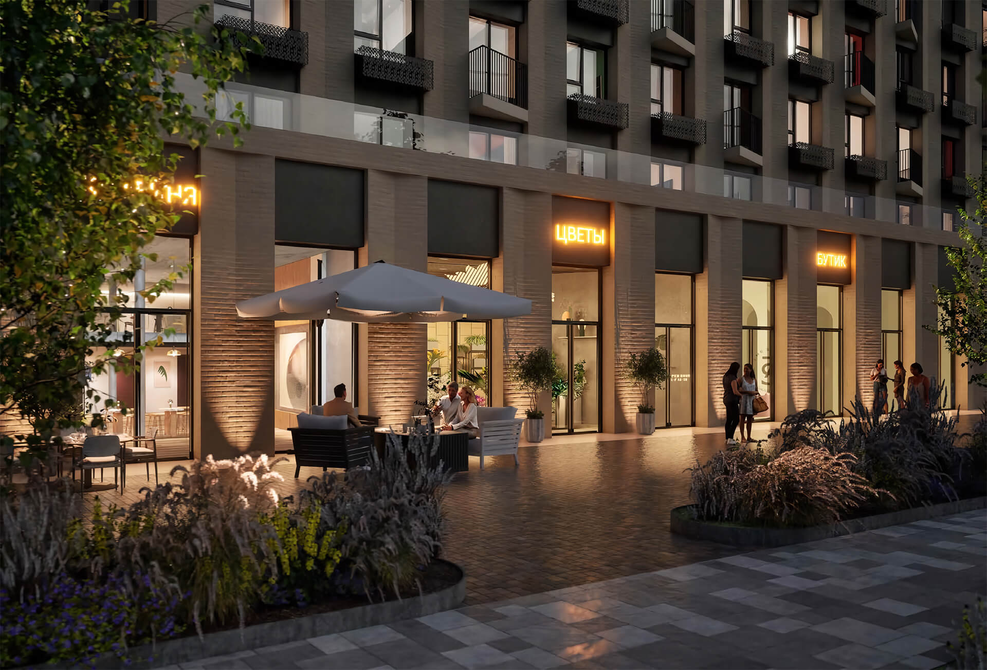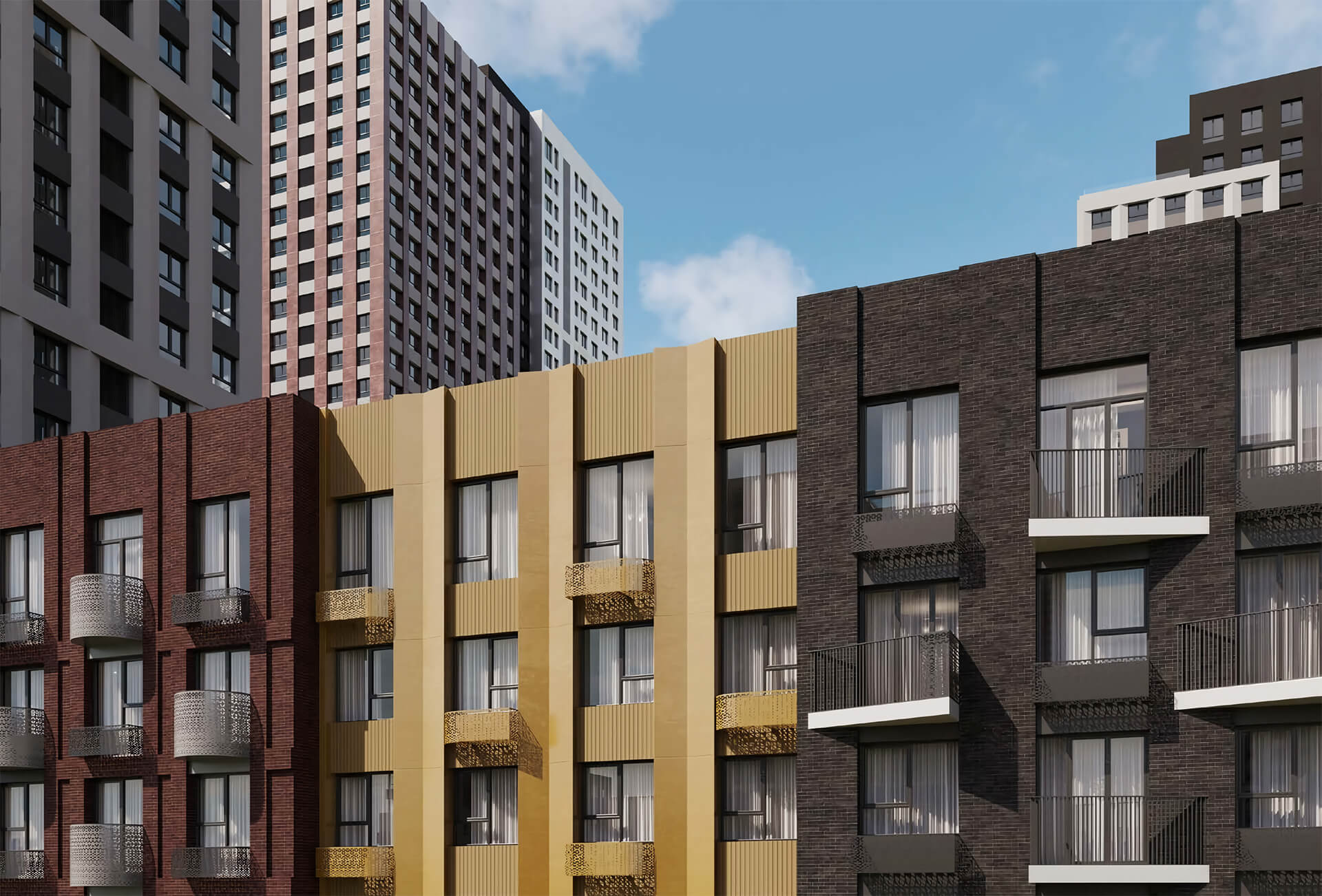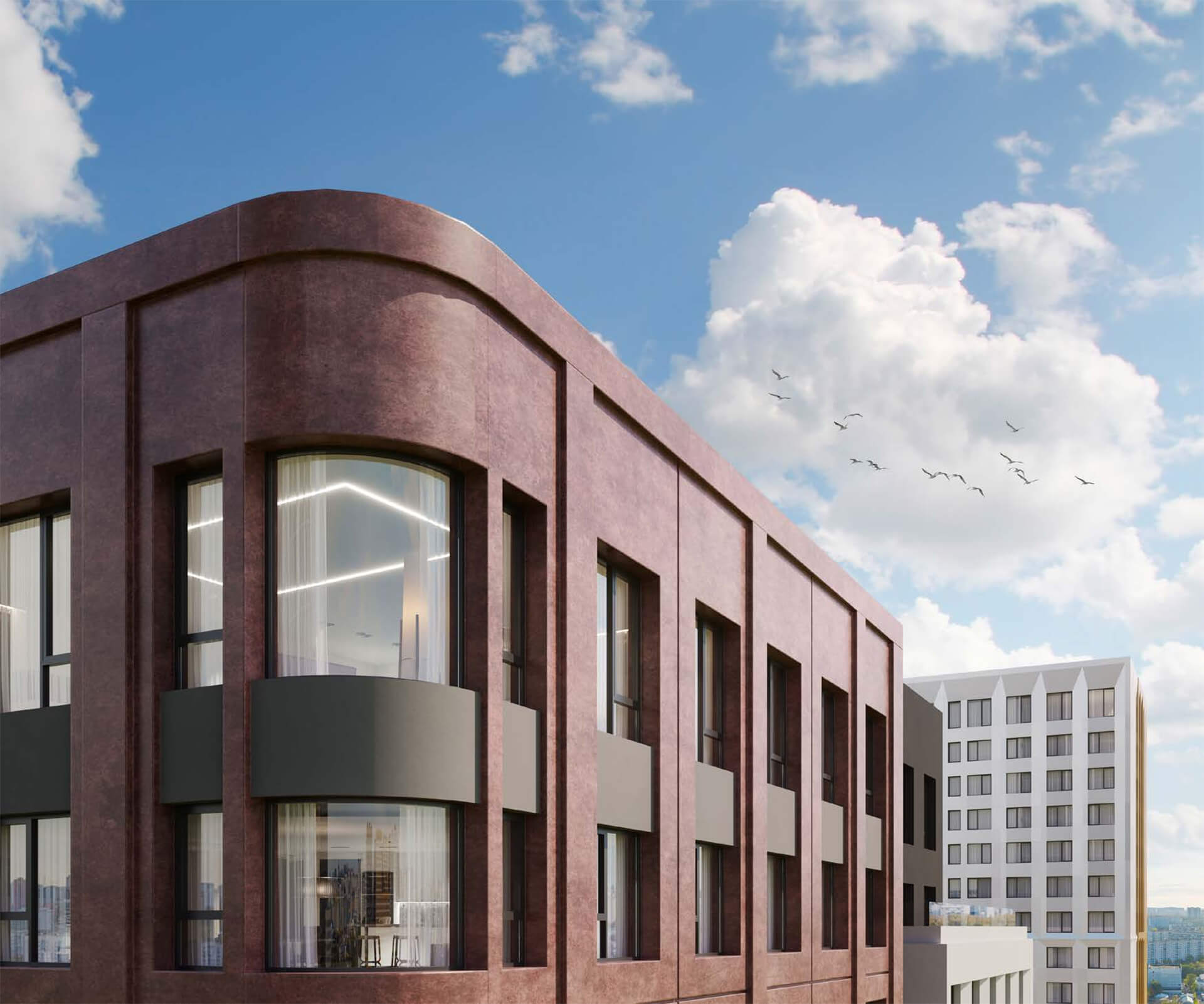 Каждый корпус выполнен в индивидуальном стиле с объёмными и динамичными фасадами, которые гармонично сочетают высотные и малоэтажные секции, формируя оригинальный облик квартала. Многообразие архитектурных форм подчеркивает статусность и уникальность комплекса, делая его заметным среди городской застройки. Наружная подсветка фасадов добавляет зданию выразительности в вечернее время, делая «Страну.Заречную» ярким архитектурным акцентом района, где каждая деталь создана для комфорта и эстетического наслаждения.